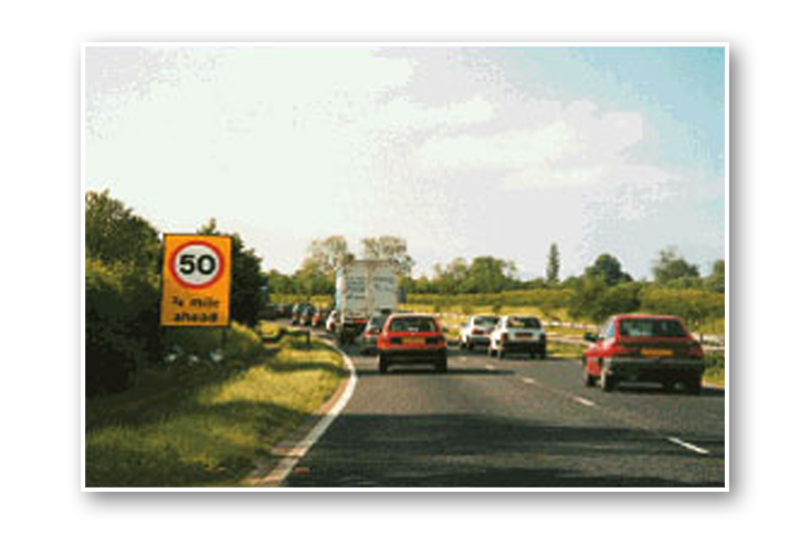 The sign gives you an early warning of a speed restriction. If you're travelling at a higher speed, slow down in good time. You could come across queuing traffic due to roadworks or a temporary obstruction.
